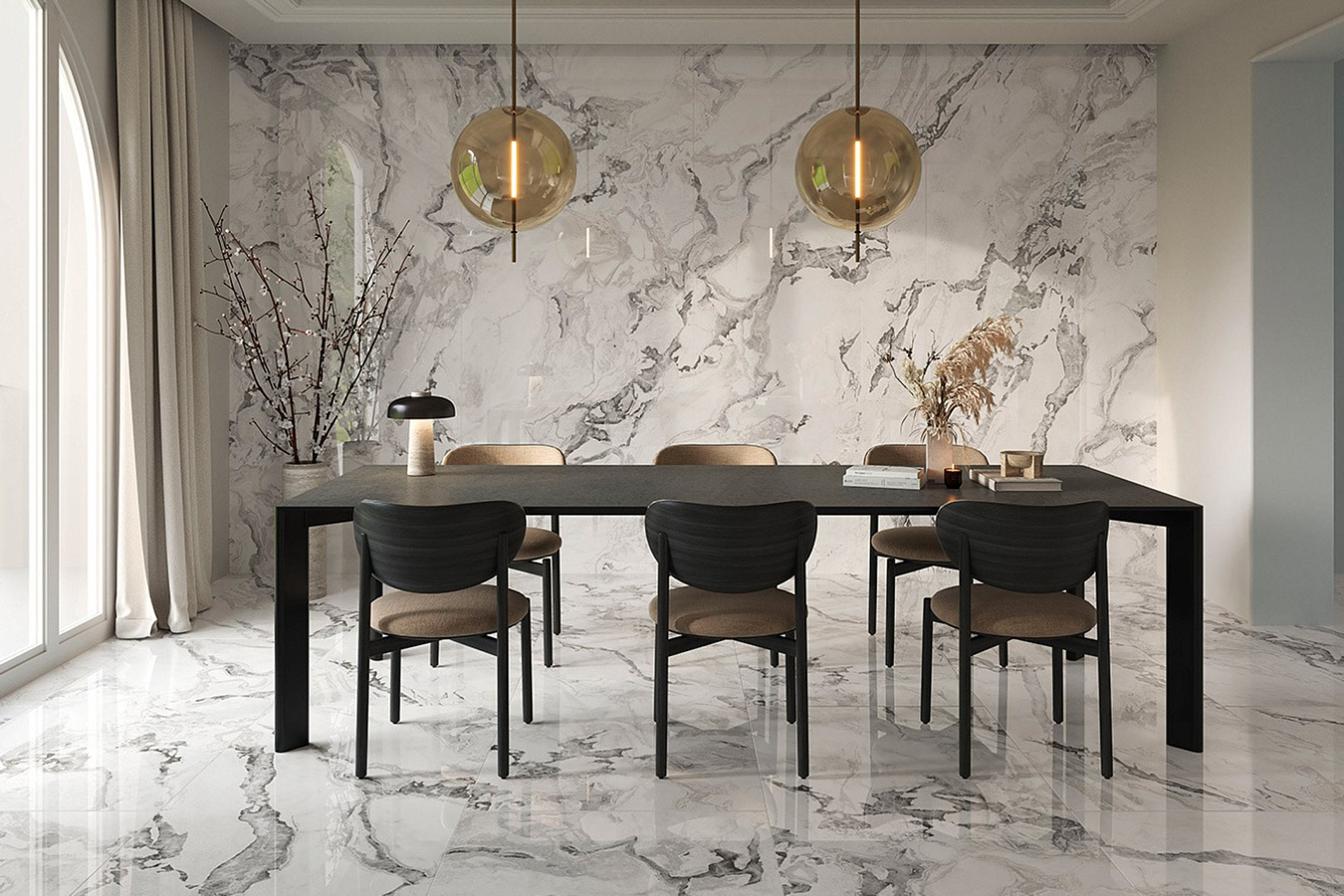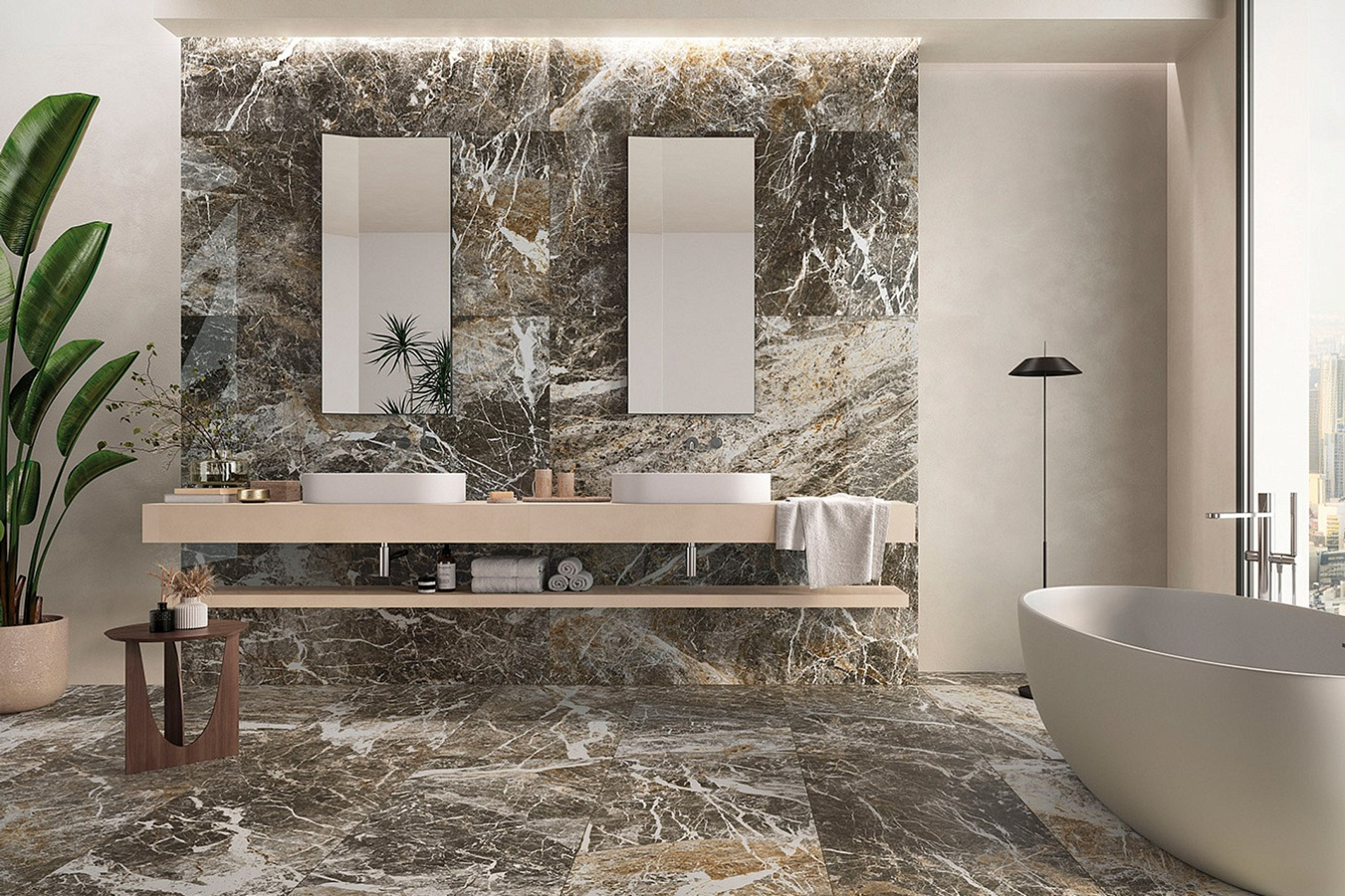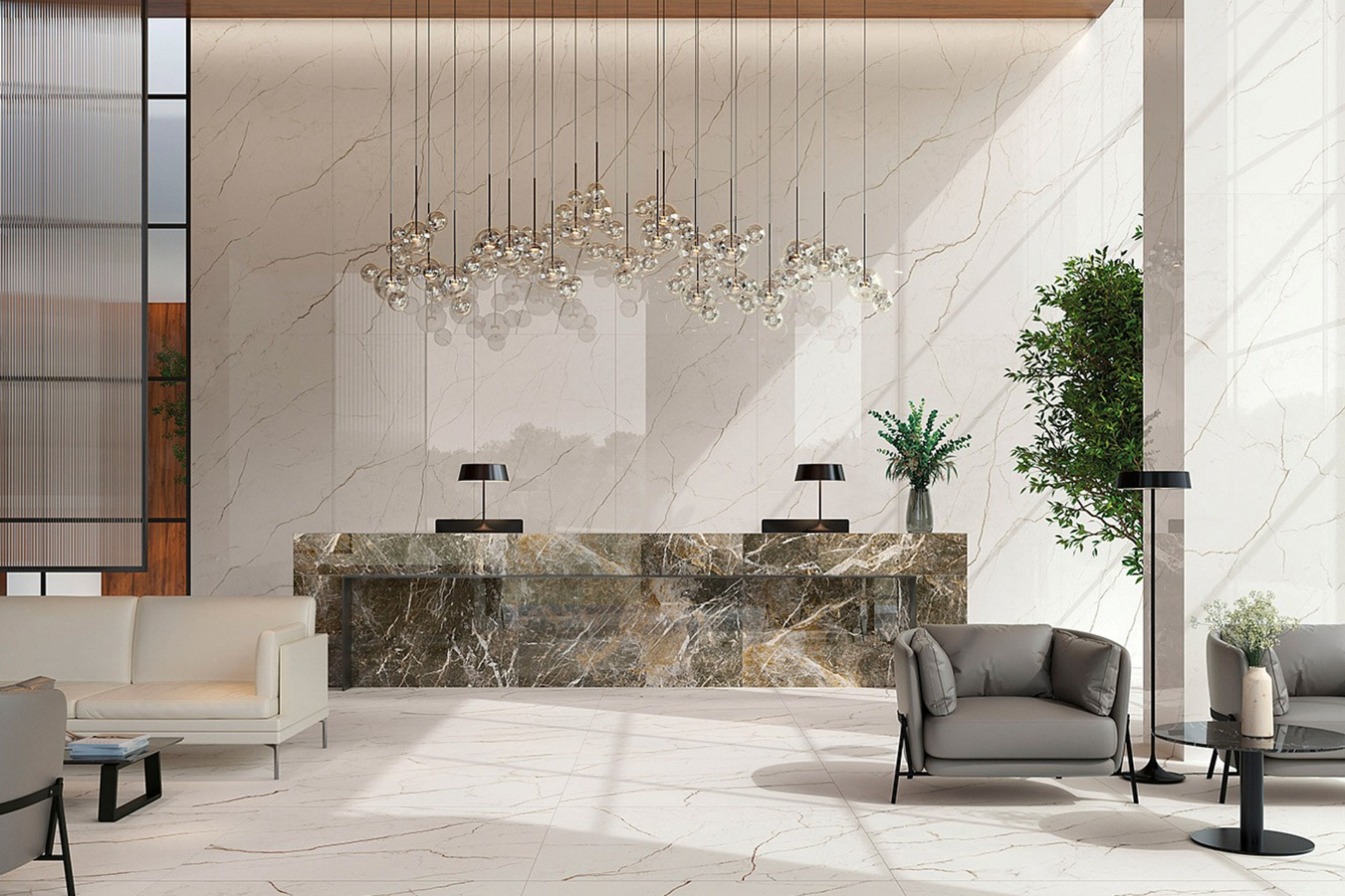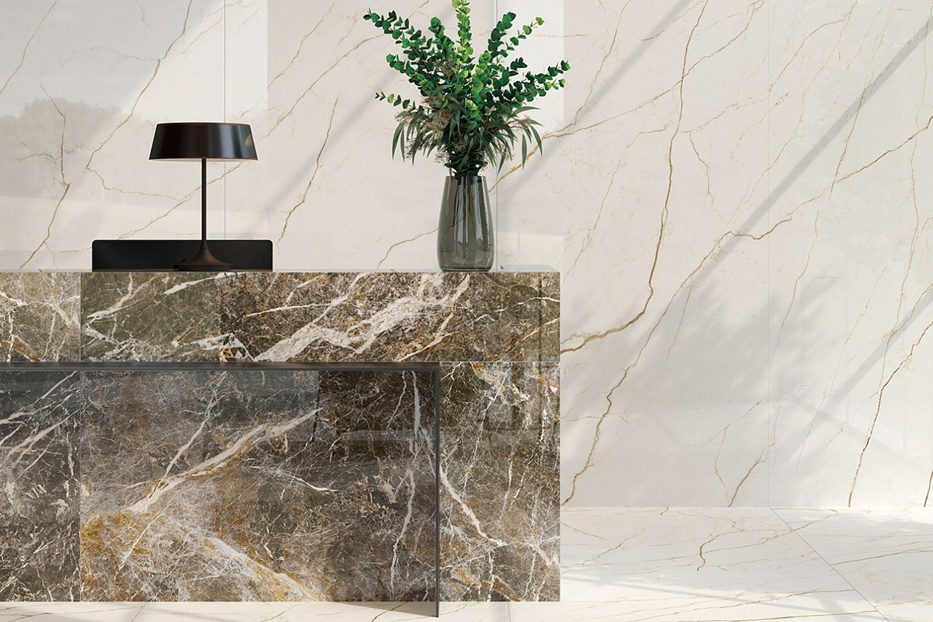 - элегантные породы мрамора и мраморной брекчии: Sahara Blanc, Oyster White и Breccia di Caravaggio;