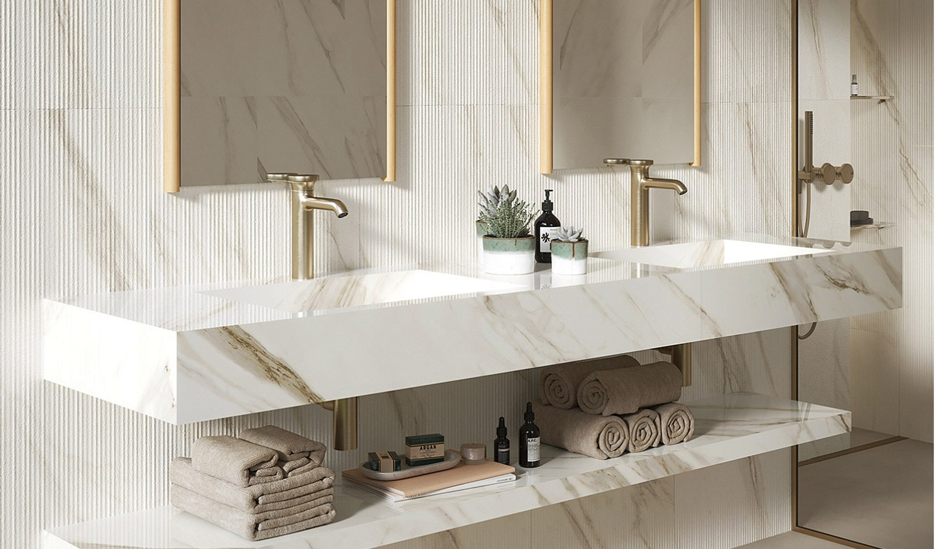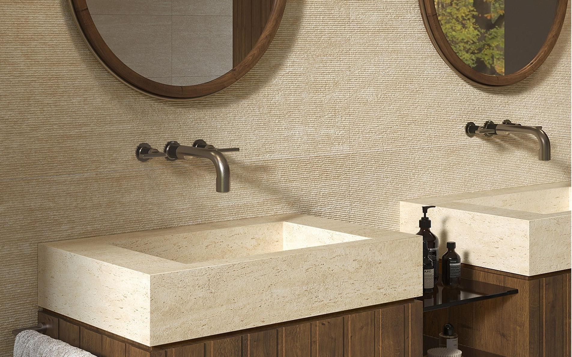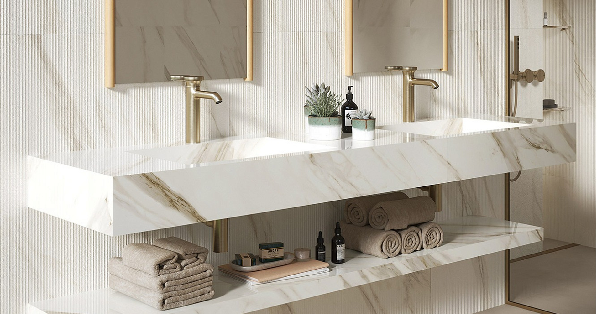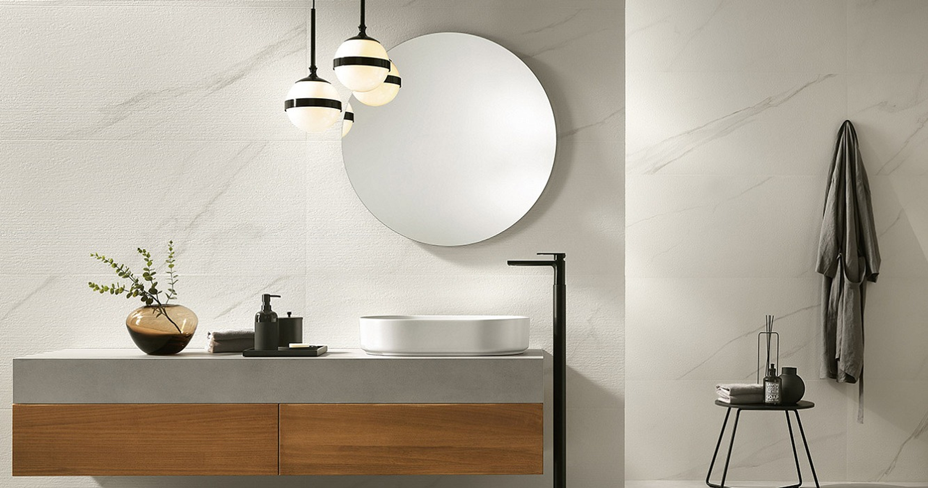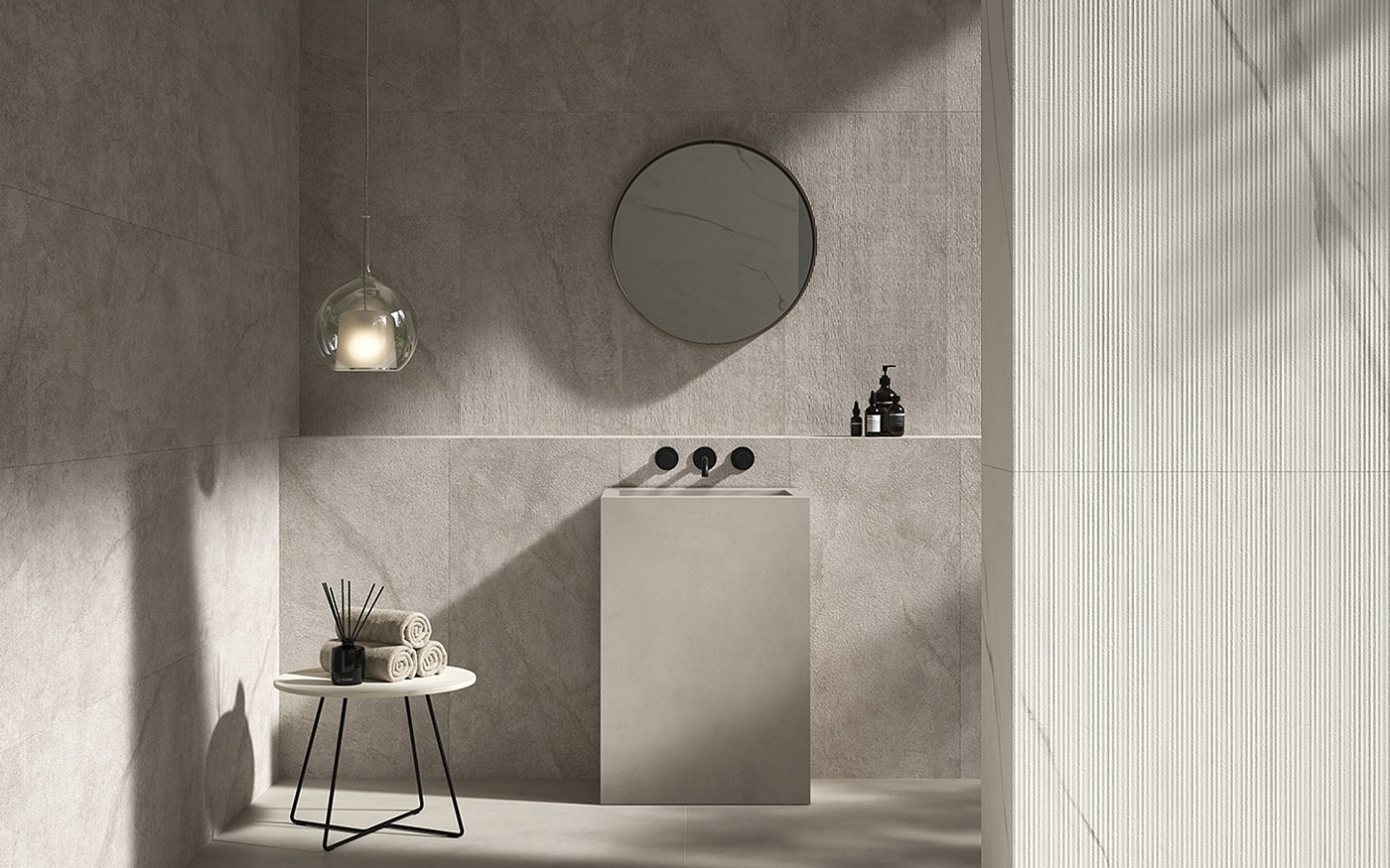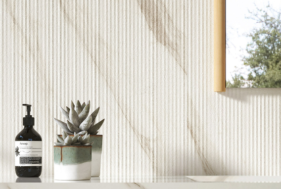 Пять сортов мрамора, отобранных из числа шедевров таких коллекций, как Marvel Travertine и Marvel Meraviglia, отражаются в трёх выразительных рельефах: Field, Reed и Crease, умножая выразительный потенциал и придавая материальность мраморным поверхностям.