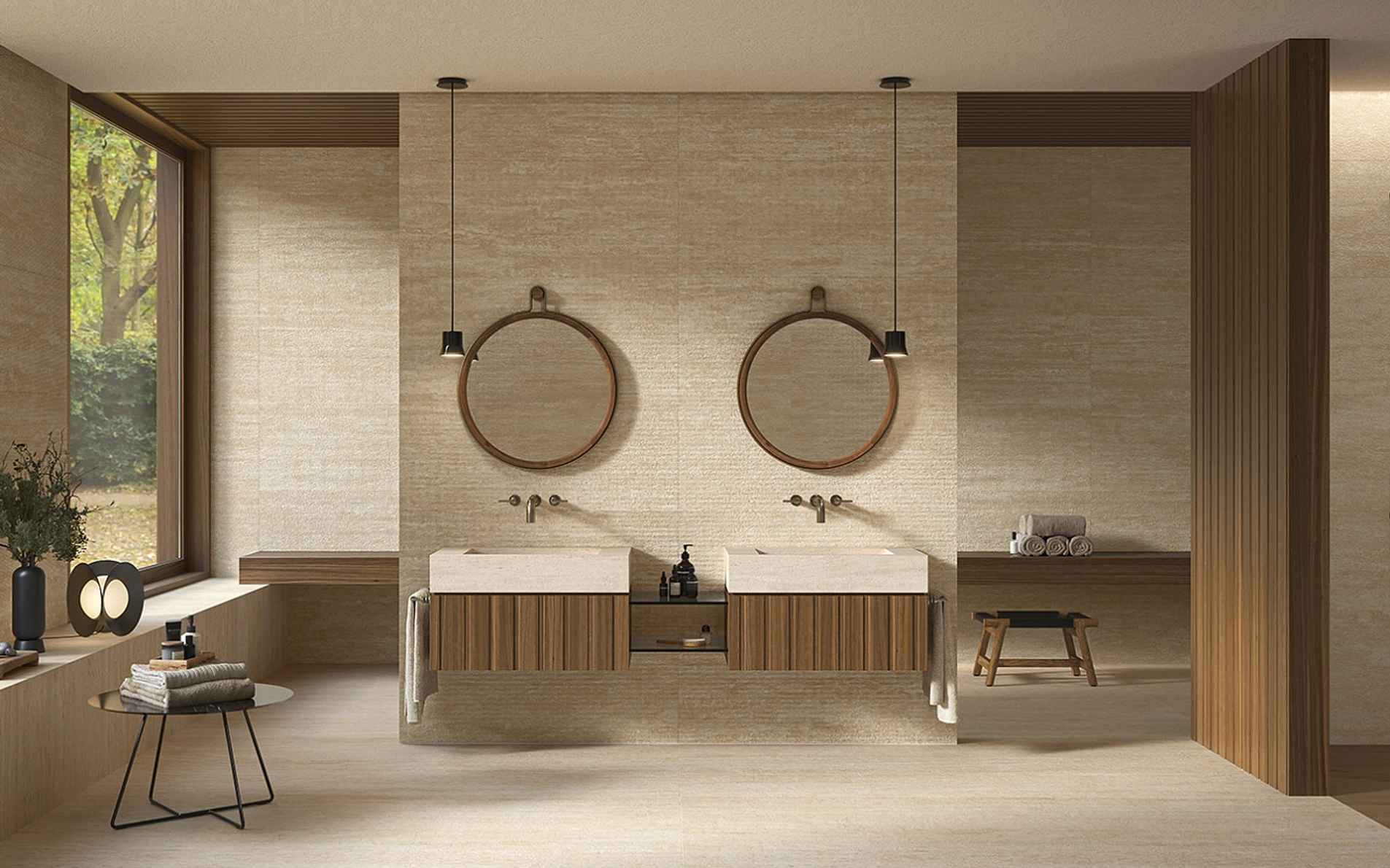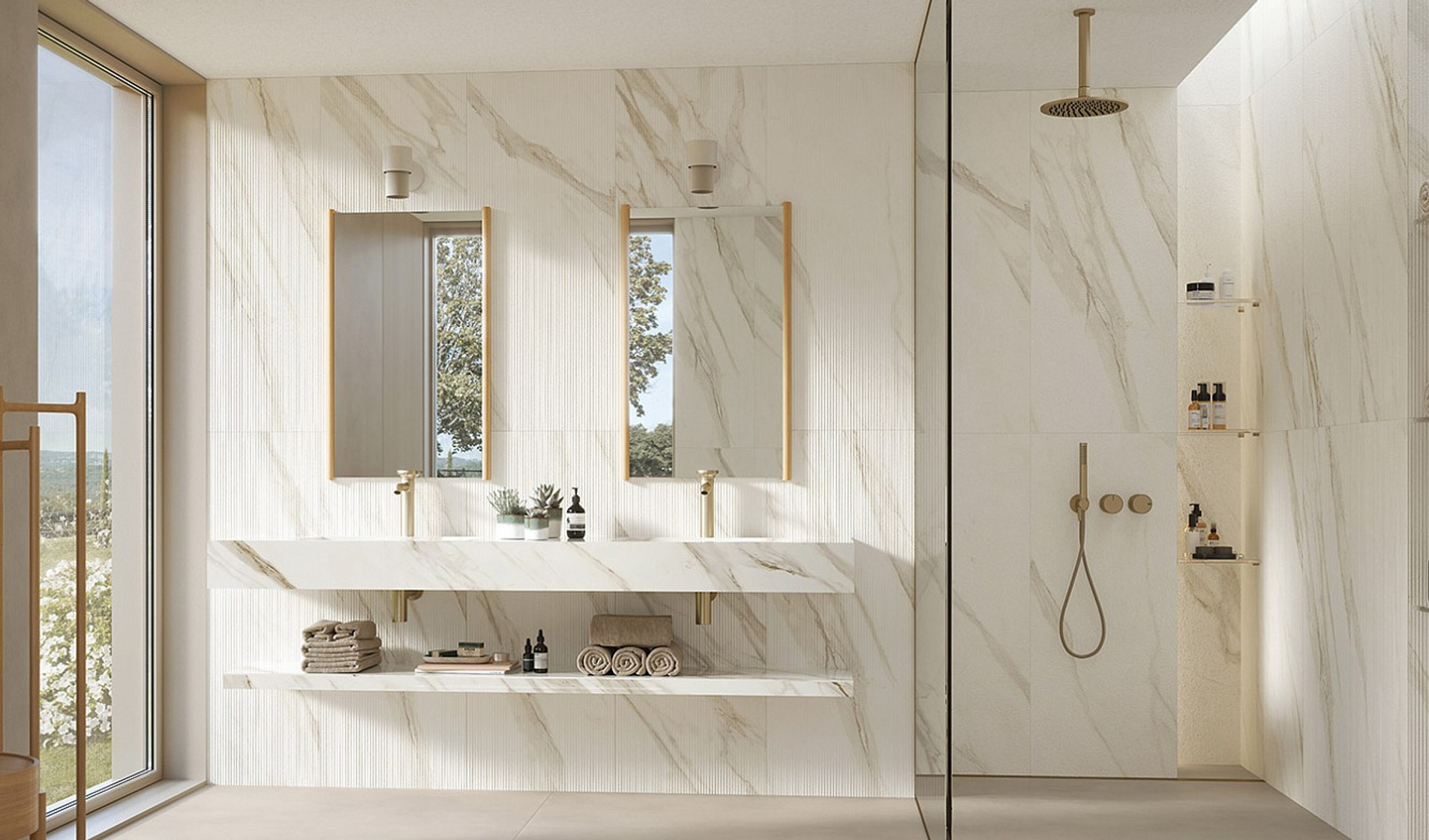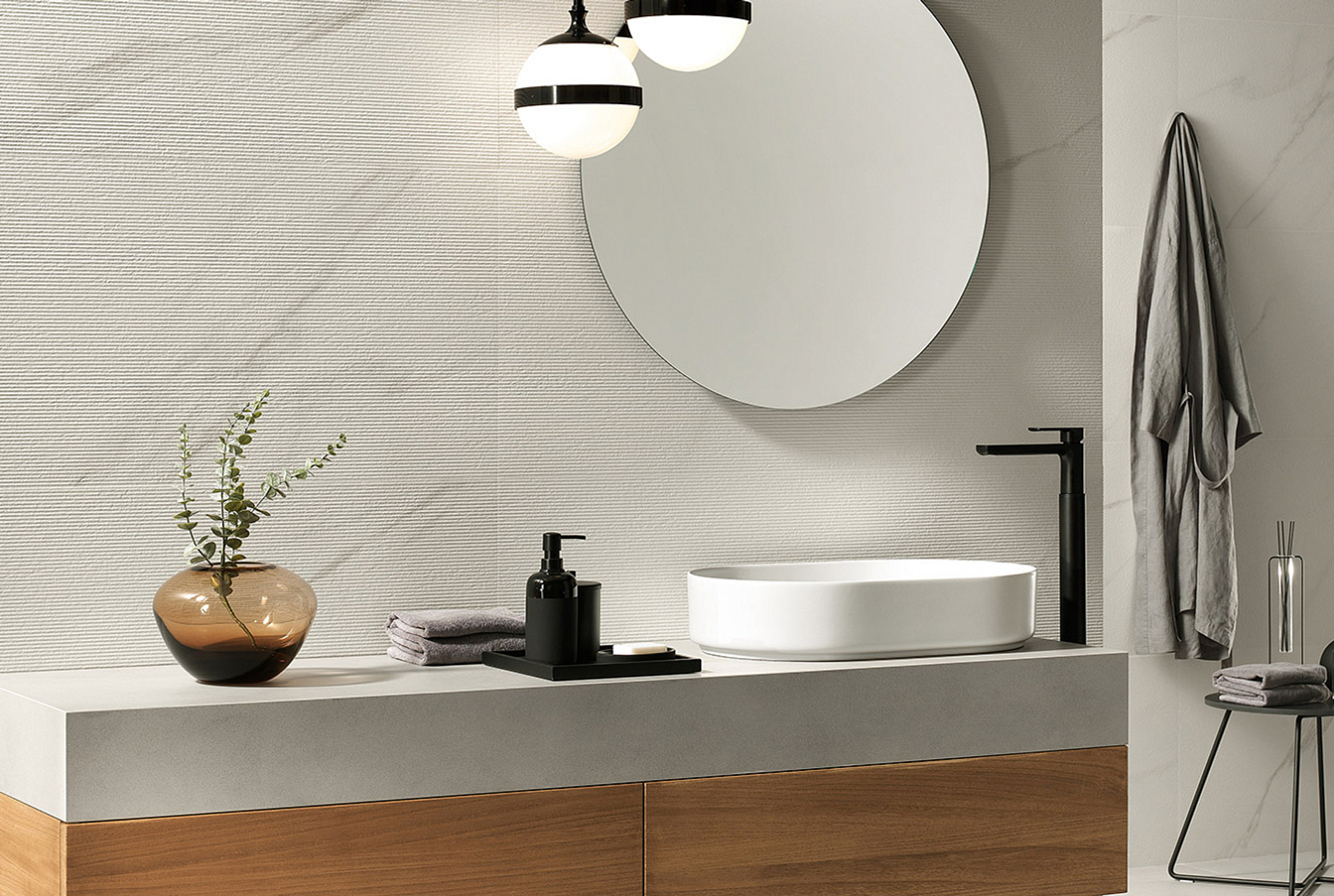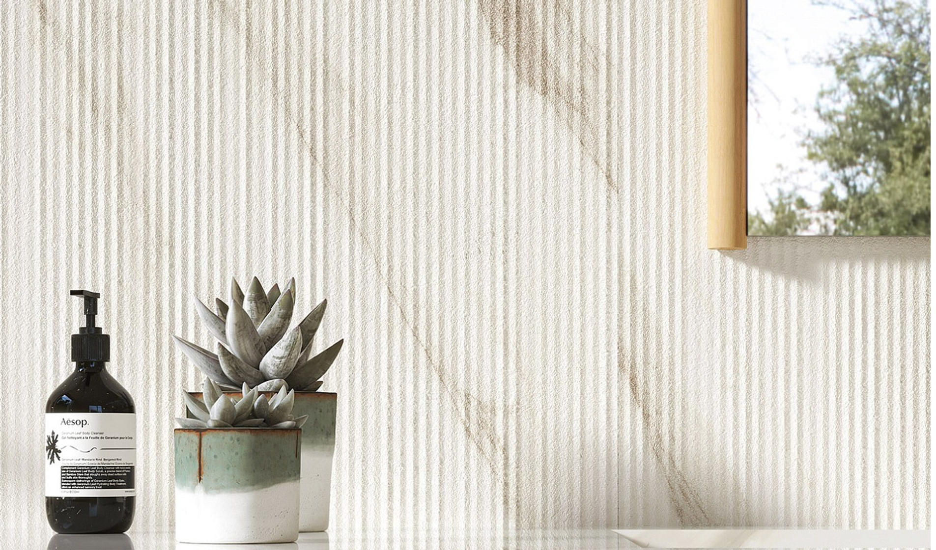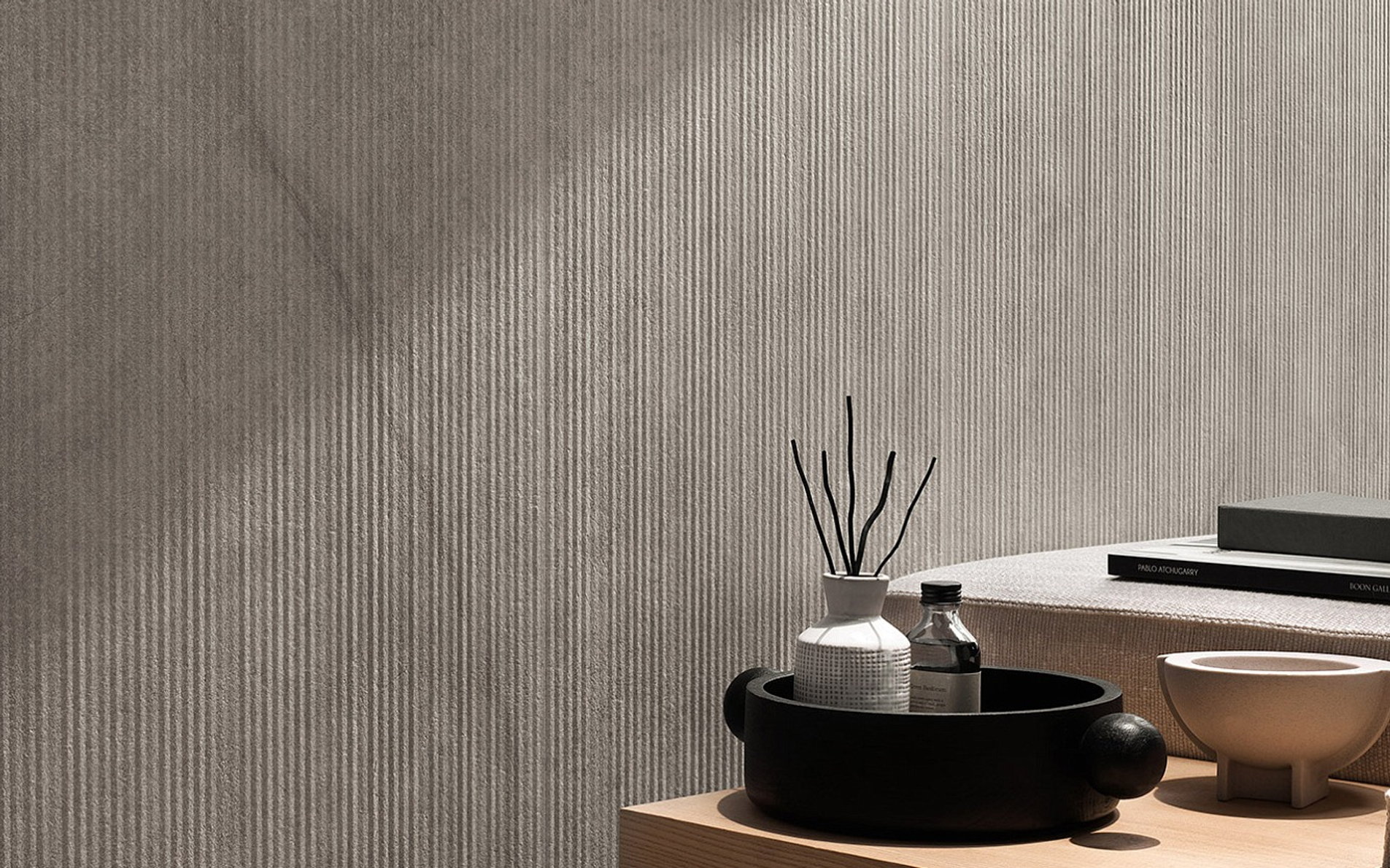 Пять сортов мрамора, отобранных из числа шедевров таких коллекций, как Marvel Travertine и Marvel Meraviglia, отражаются в трёх выразительных рельефах: Field, Reed и Crease, умножая выразительный потенциал и придавая материальность мраморным поверхностям.