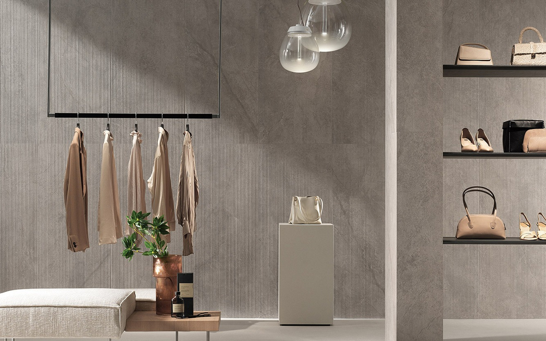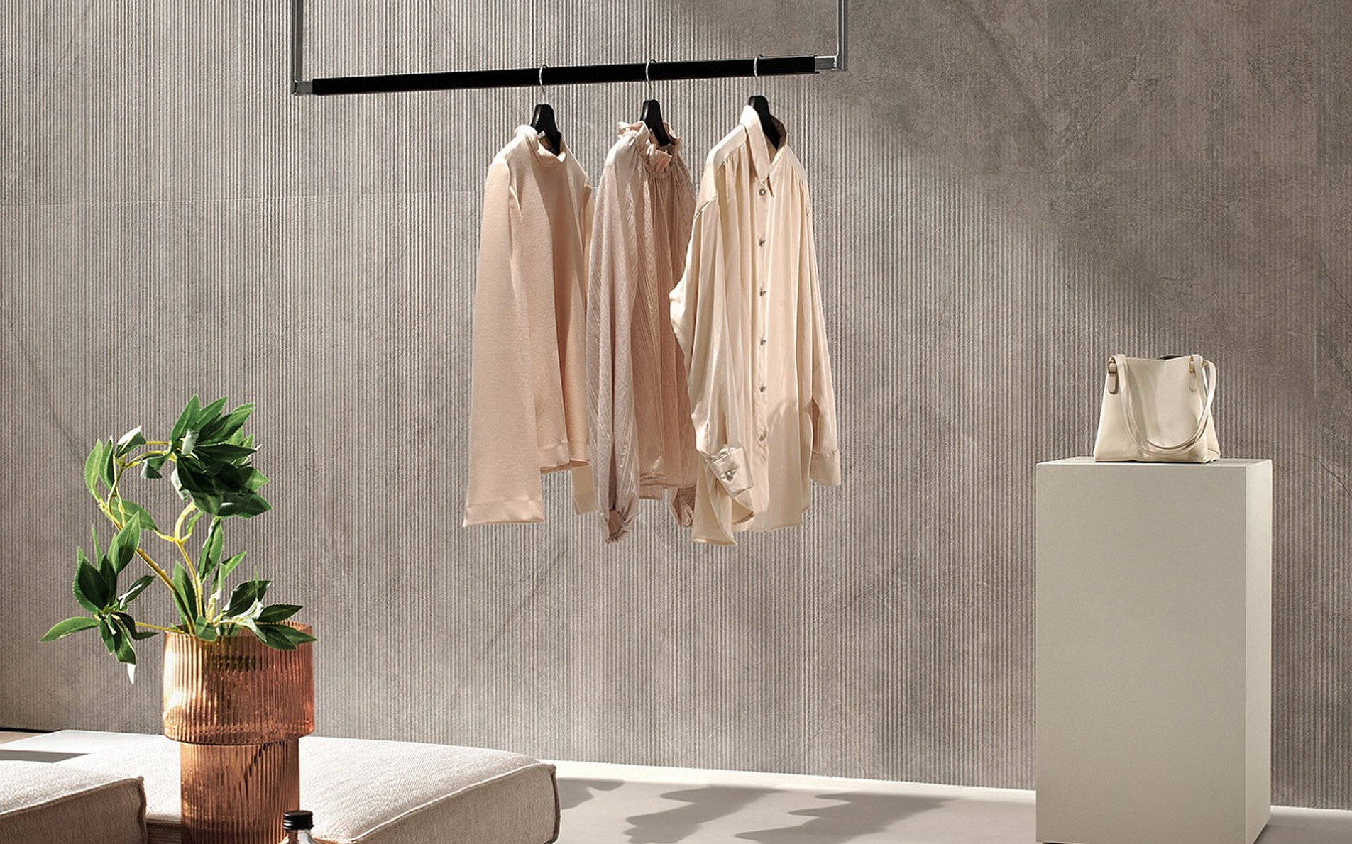 Marvel 3D находит свое максимальное выражение в сочетании с цементным эффектом Boost Balance и коллекцией керамического паркета Entice.