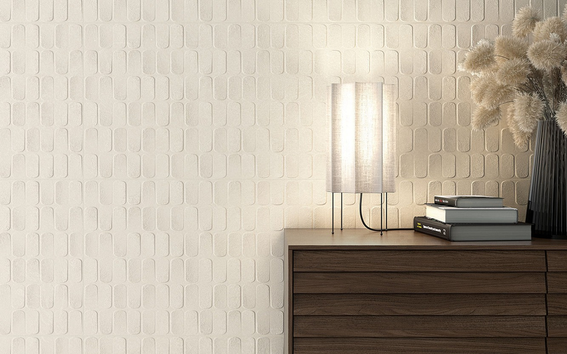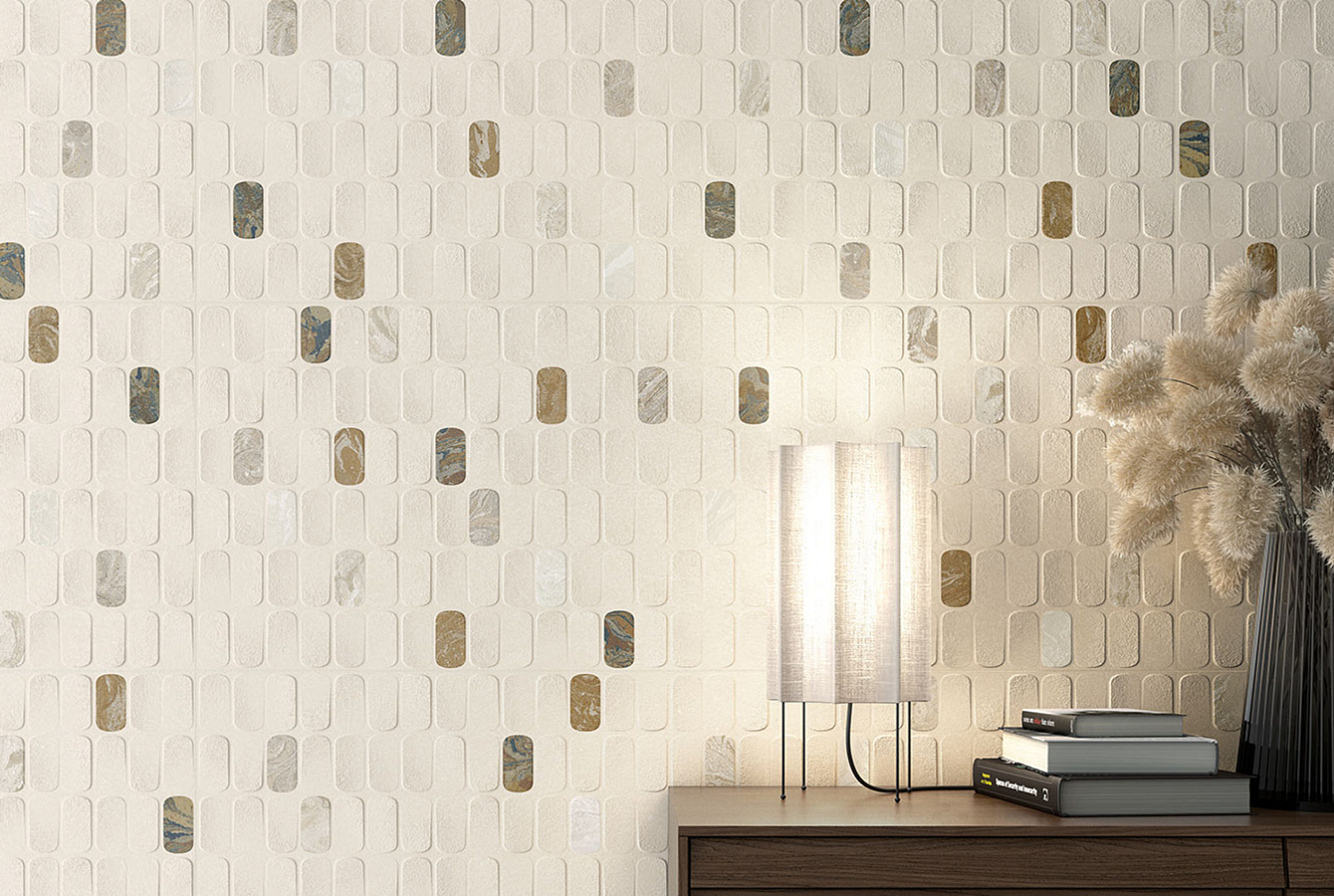 Настенная плитка выполнена в едином формате 45х120 см и трёх графических вариантах: Tiramisu-R Blanco, Savoiardi-R Blanco, Savoiardi-R Tutti Frutti.