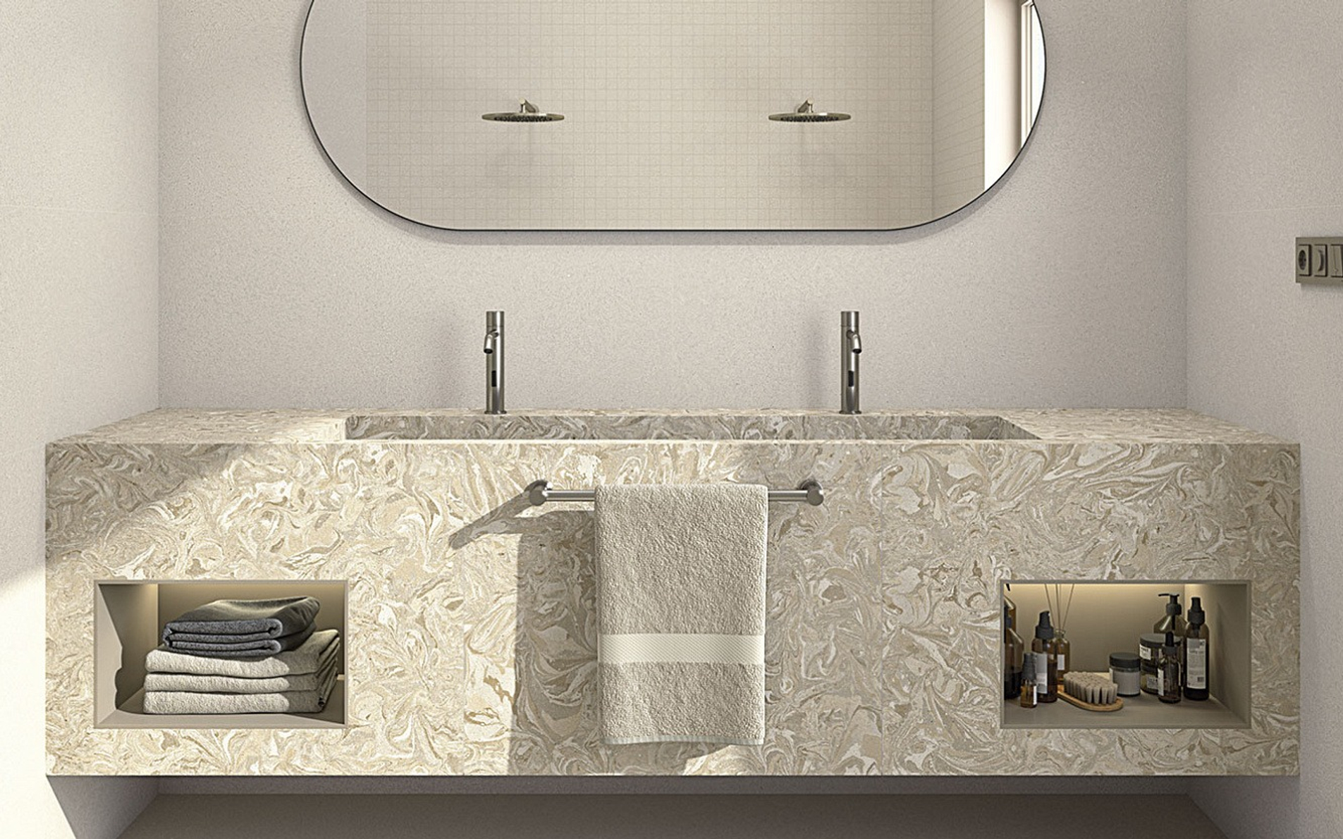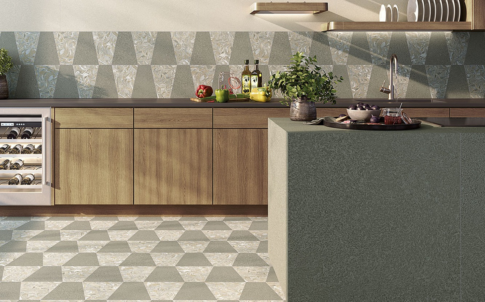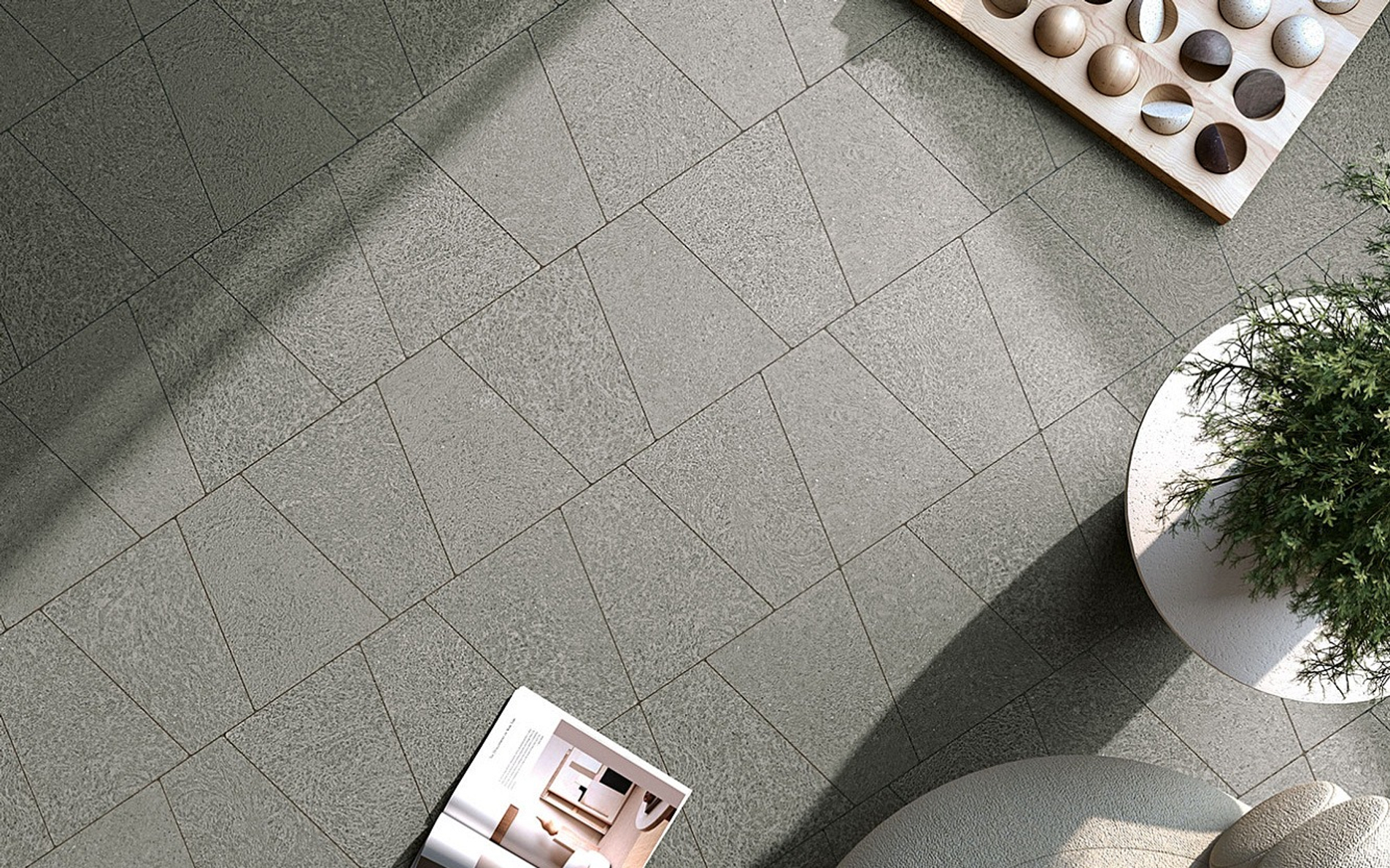 Керамогранит доступен в трёх выверенных оттенках: Greige, Nuvola и Ombra и пяти форматах, предназначенных для различных проектных нужд: ректифицированный 120х120 см, 80x80 см, 60x120 см, 59,3x59,3 см и неректифицированный 60х60 см.