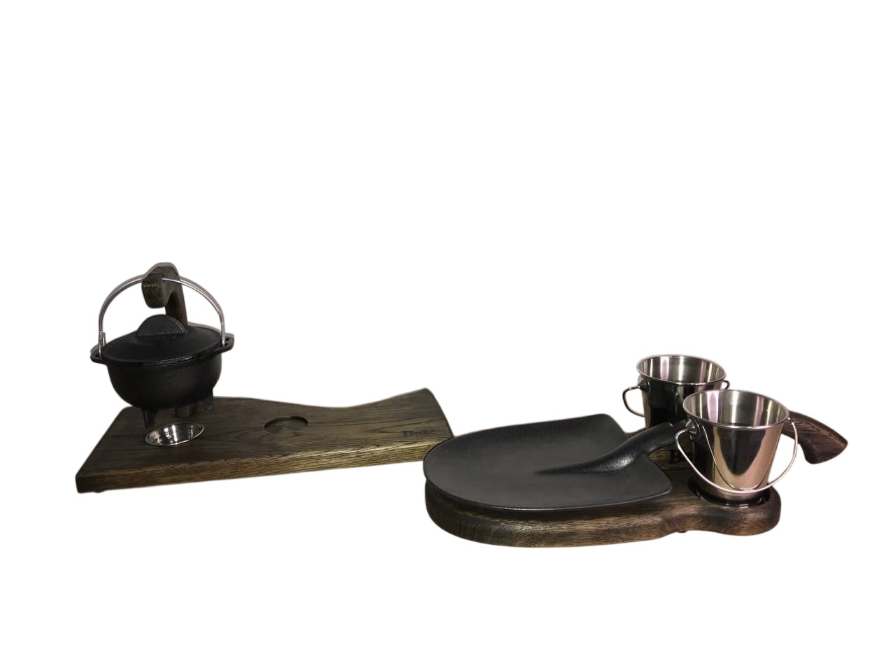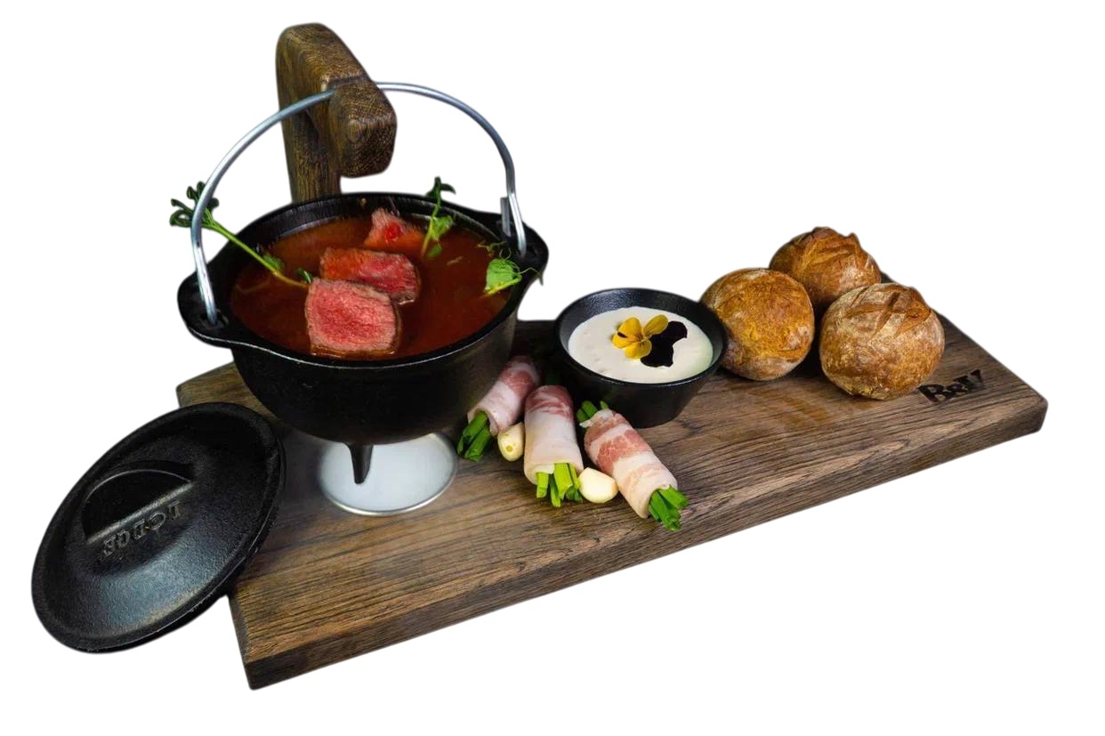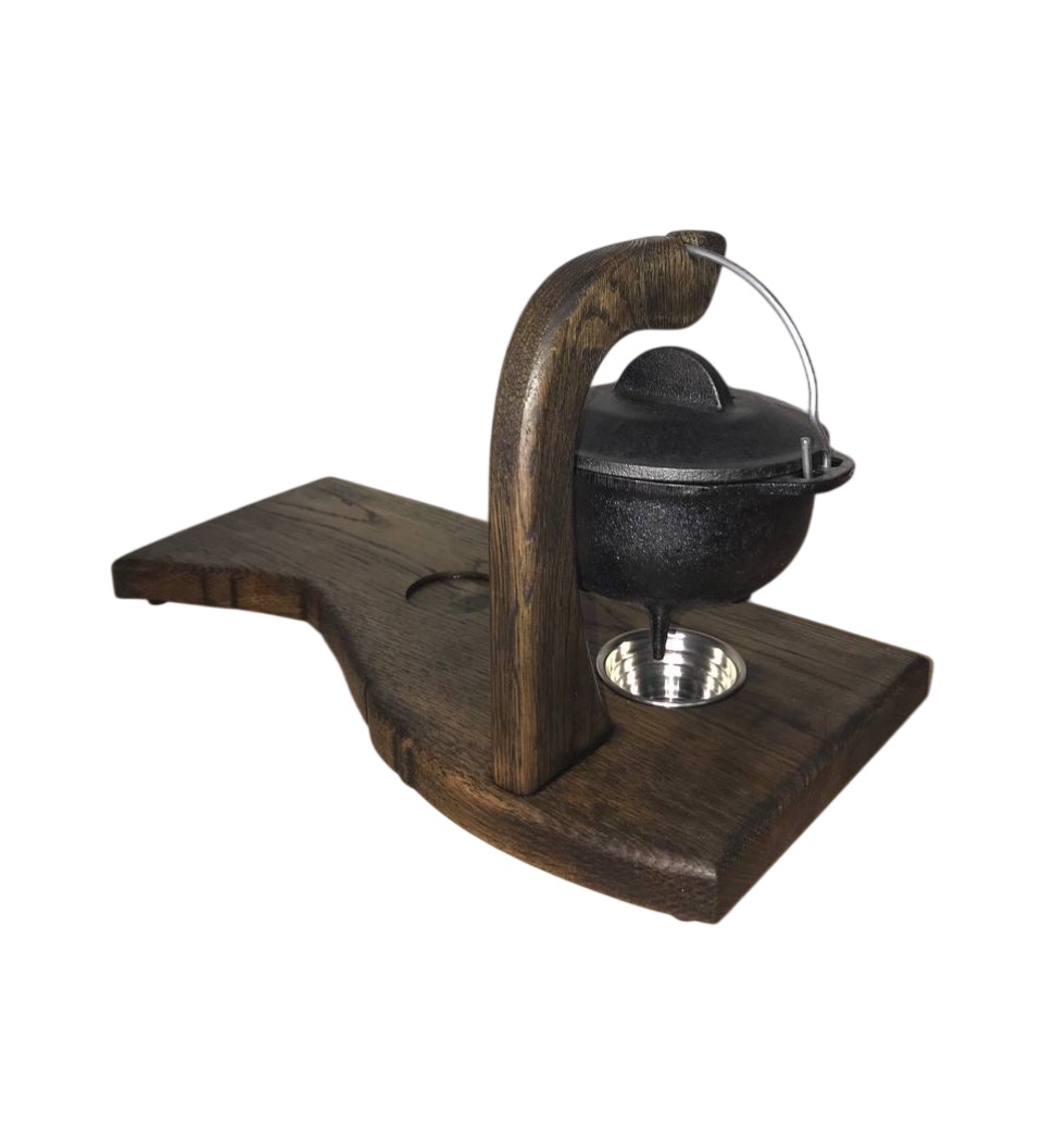 На фотографии изображена деревянная доска для подачи первого блюда и закуски, выполненная из массива дуба. Доска имеет нестандартную форму с закругленными углами и оснащена удобной Г-образной рукояткой, на которой держится металлическая кастрюлька, предназначенная для подачи первого блюда. Под металлической кастрюлей находится выемка для установки свечи, которая подогревает блюдо, сохраняя его теплым. Доска выглядит аккуратно и функционально, что делает ее отличным выбором для сервировки блюд.