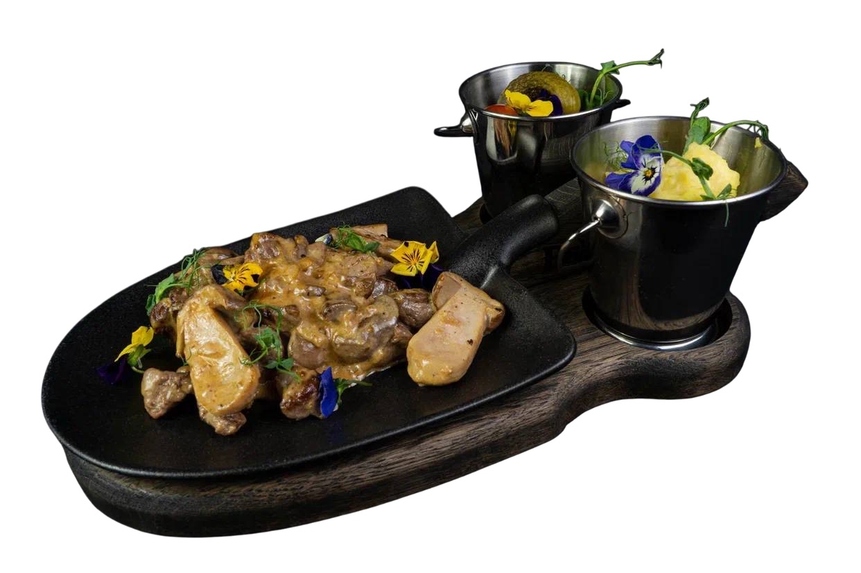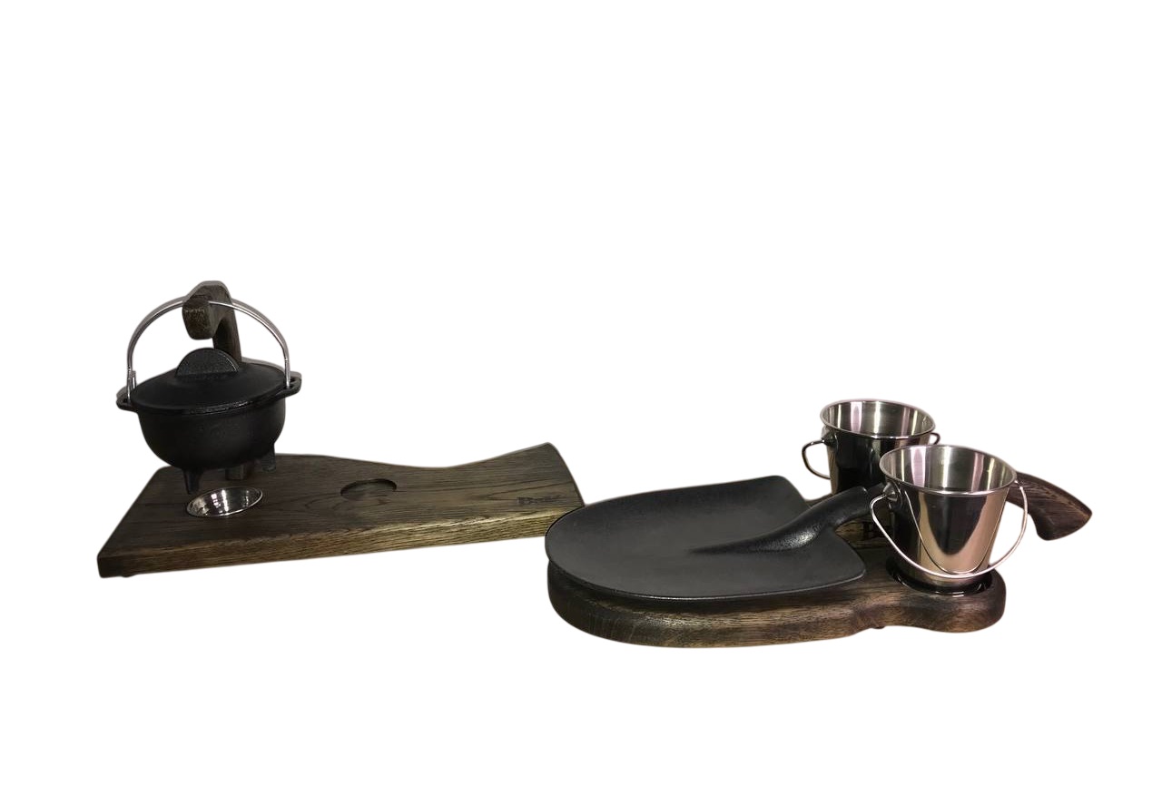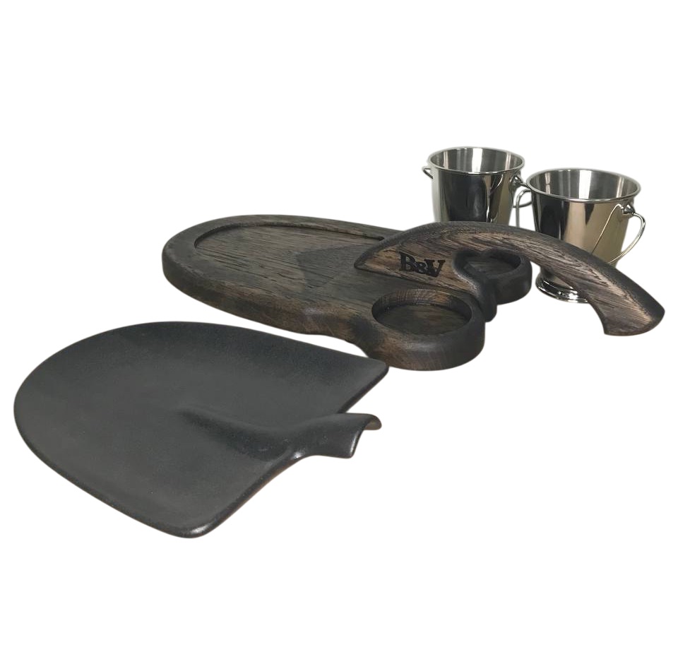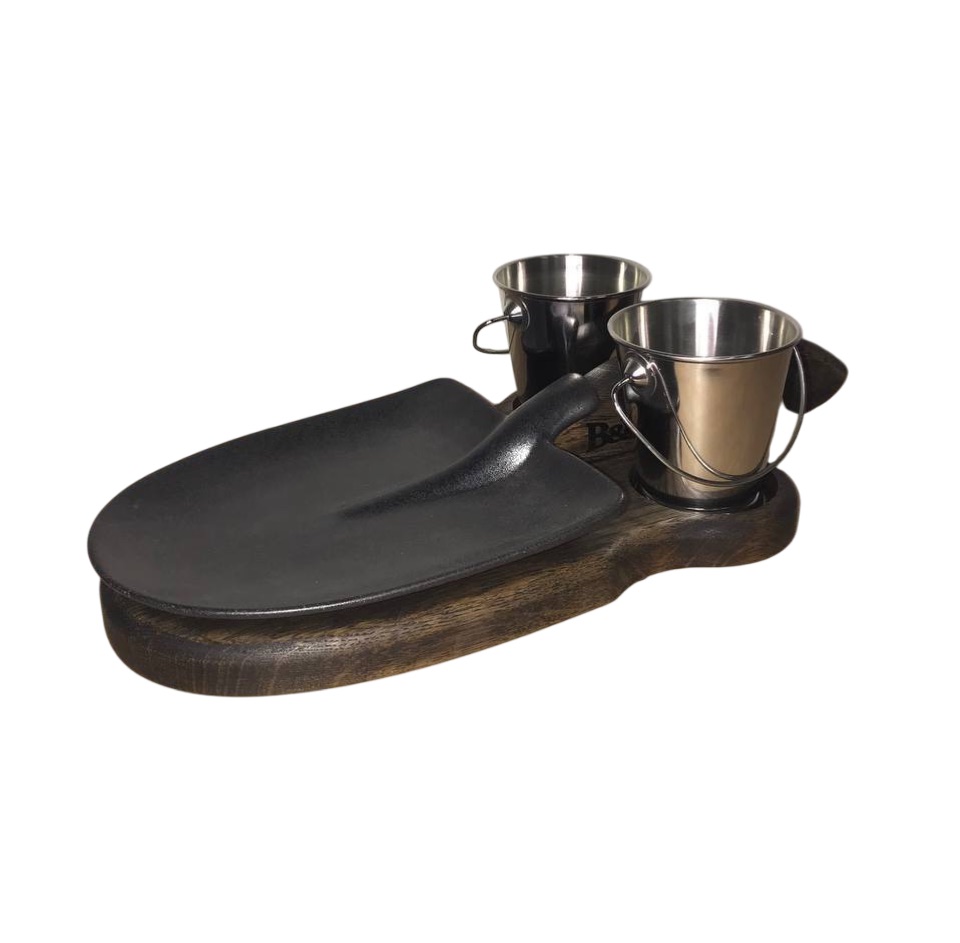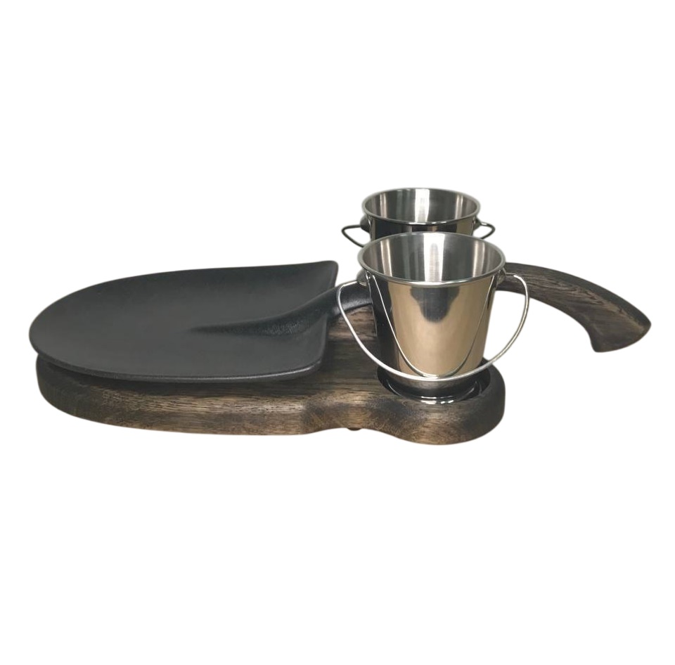 На фотографии представлена дубовая деревянная доска для подачи, которая отличается элегантным дизайном и функциональностью. Доска оснащена удобной изогнутой рукояткой, что делает ее легкой в использовании и придает ей изысканный вид. В доске предусмотрены два специальных отверстия, в которые вставлены металлические ведерки, предназначенные для подачи закусок. Центральное место на доске занимает тарелка в форме лопаты, на которой можно подавать основное блюдо. Доска выполнена из дуба, что обеспечивает ей прочность и долговечность, а также придает ей эстетичный вид.