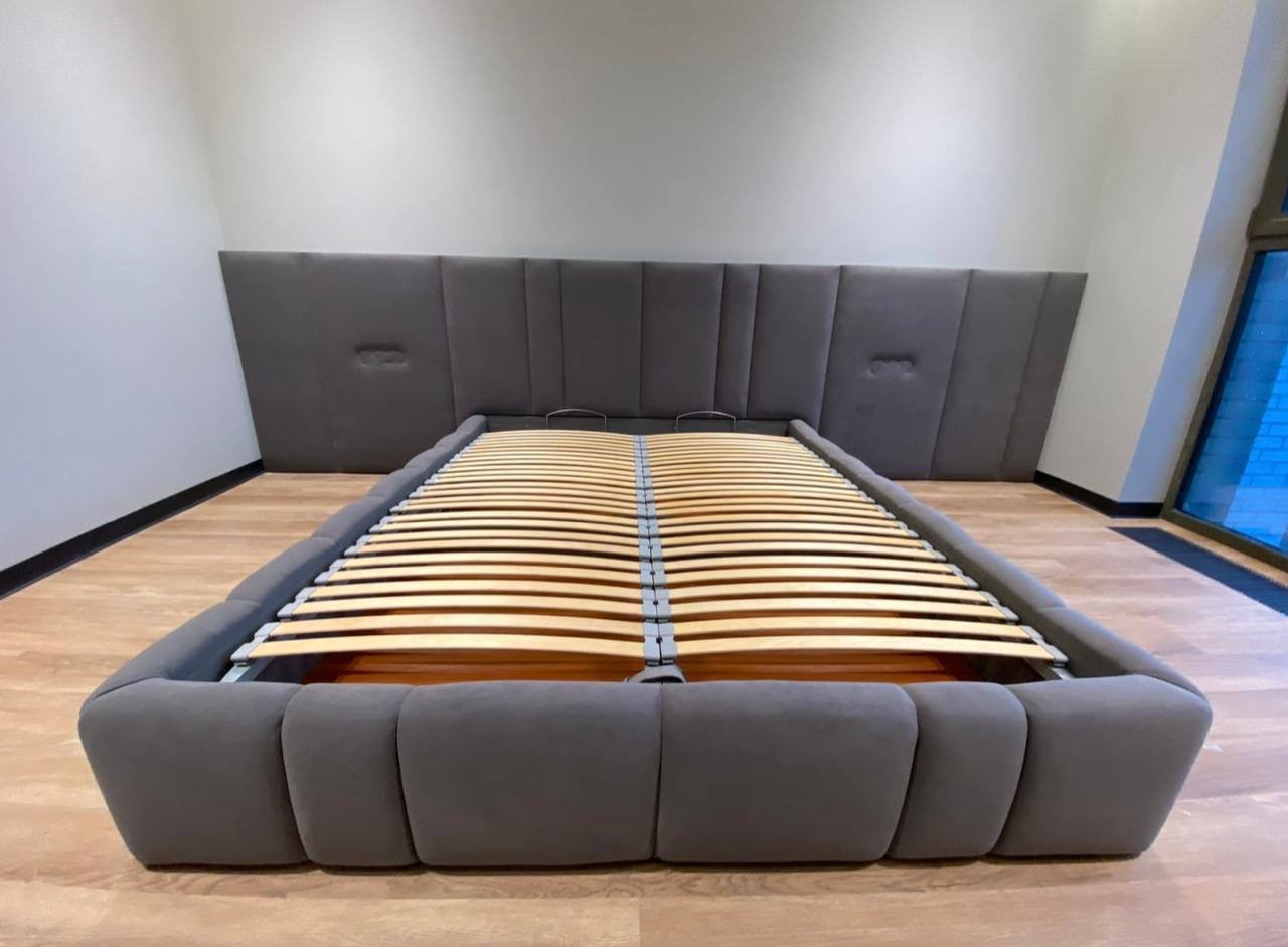 Эта двуспальная кровать — дизайнерский аккорд, созданный для ценителей безупречного стиля и комфорта. В её основе лежит концепция ритма и симметрии, воплощённая в гармоничной игре модулей. Мягкое изголовье, собранное из вертикальных элементов различной ширины, напоминает благородный фасад с асимметричными пилястрами, придавая интерьеру глубину и архитектурную выразительность. Эта же идея находит своё отражение в царгах и изножье, где модули складываются в симметричный рисунок, создавая ощущение идеальной сбалансированности и законченной композиции.