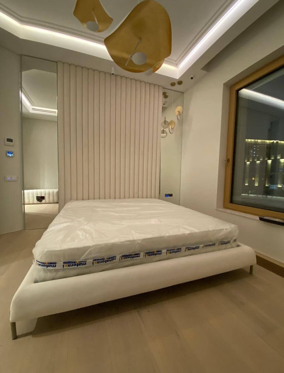 Эта двуспальная кровать — образец современной эстетики, где строгость линий встречается с мягкостью форм. Монументальное изголовье, расчерченное на выразительные вертикали, визуально вытягивает пространство, создавая ощущение надежного укрытия и архитектурной глубины. Этому мощному акценту вторят плавно изогнутые царга и изножье, смягчая геометрию и придавая всей конструкции удивительную воздушность и динамику.
