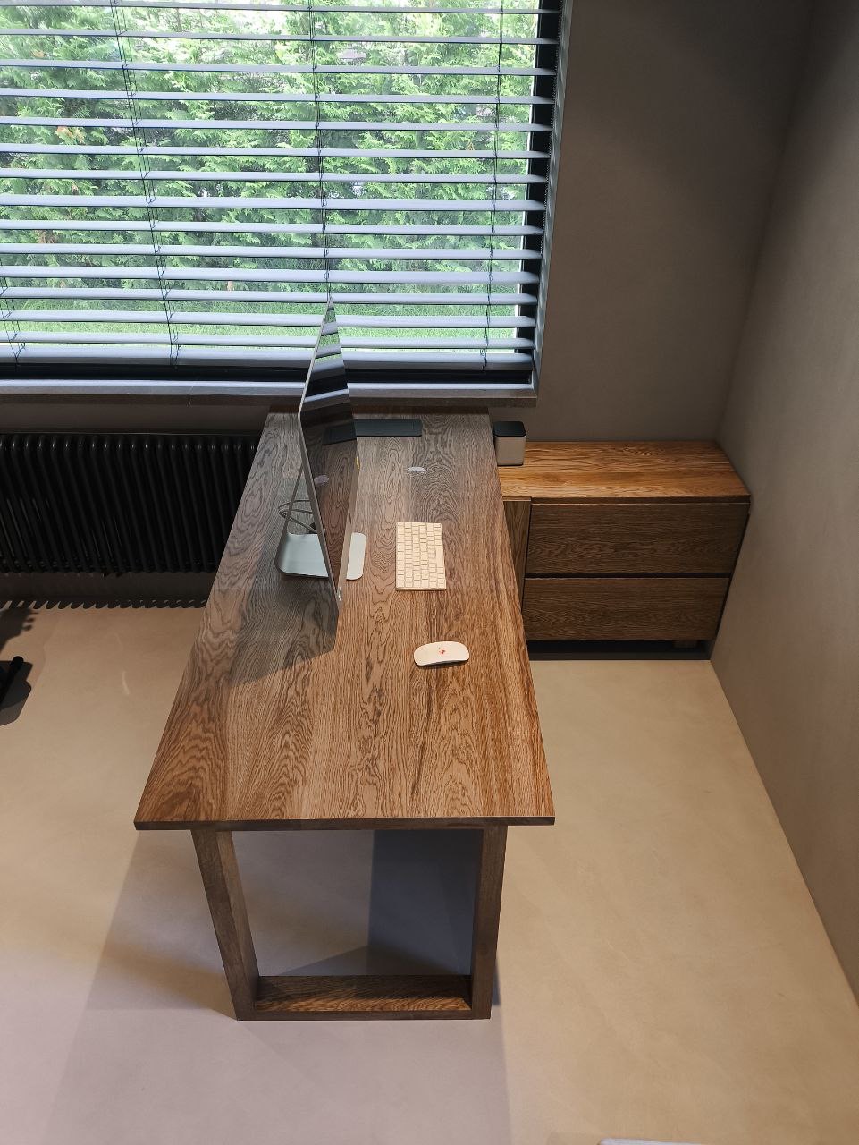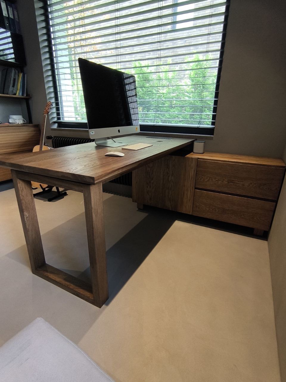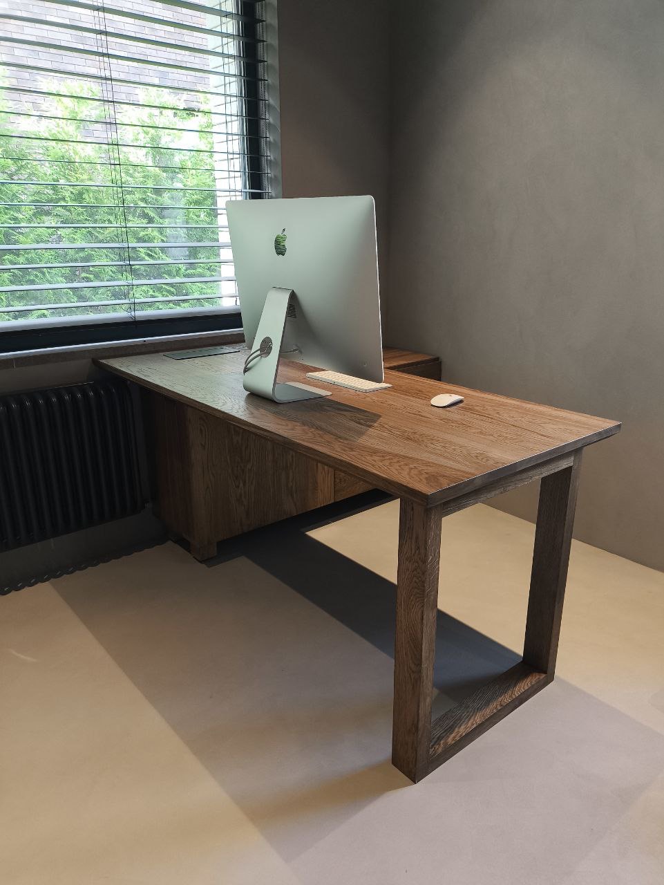 Это рабочее место в кабинете, выполненное по индивидуальному проекту заказчика, представляет собой гармоничное сочетание функциональности и эстетики. Стол и тумба изготовлены из массива дуба, что придает им благородный и долговечный вид. Столешница оснащена интегрированной группой выдвижных розеток и беспроводной зарядкой скрытого монтажа, что обеспечивает удобство использования и современный подход к организации рабочего пространства. Скрытое пространство для коммуникации электричества и слаботочных систем позволяет поддерживать порядок и чистоту на рабочем месте. У тумбы два выдвижных ящика, также выполненные из массива дуба и оснащенные скрытыми доводчиками, что обеспечивает плавное и бесшумное открытие и закрытие. Это рабочее место сочетает в себе стиль, комфорт и функциональность, создавая идеальные условия для продуктивной работы.